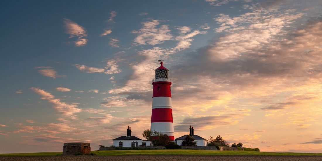 Image taken just before sunset at Happisburgh, Norfolk showing the late evening light catching the clouds over the lighthouse
