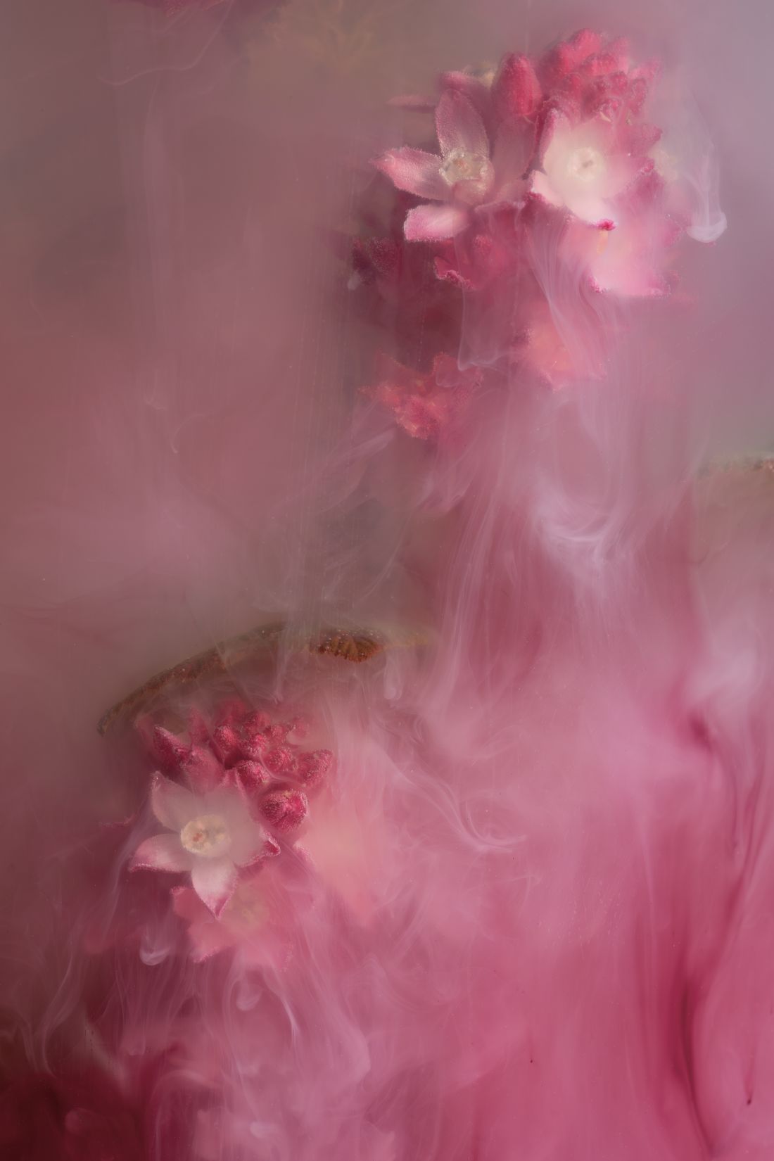 In this ethereal image, the submerged flowering currant, also known as Ribes, is cloaked in a delicate milk and pink hue. The flowers exude a sense of tranquility and beauty as they float gracefully underwater, creating a stunning and abstract spring scene. The cloudy water adds a dreamy quality to the composition, making it a truly captivating sight.