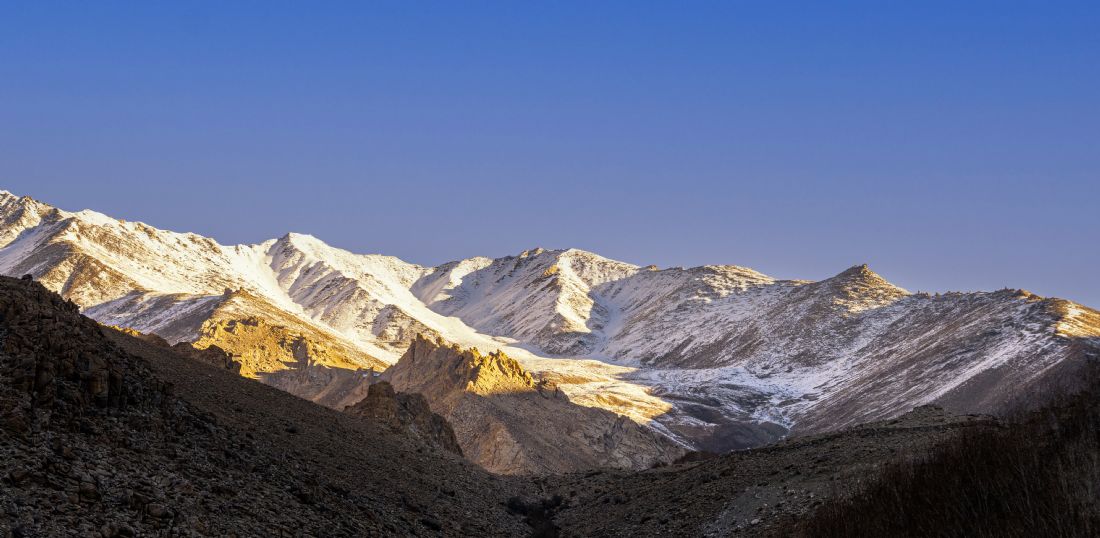 The first rays of light illuminate the mountains behind the Ulley Valley in Ladakh, while the interplay of light and shadow creates a breathtaking landscape that is both serene and powerful, reflecting the timeless beauty of this remote region.