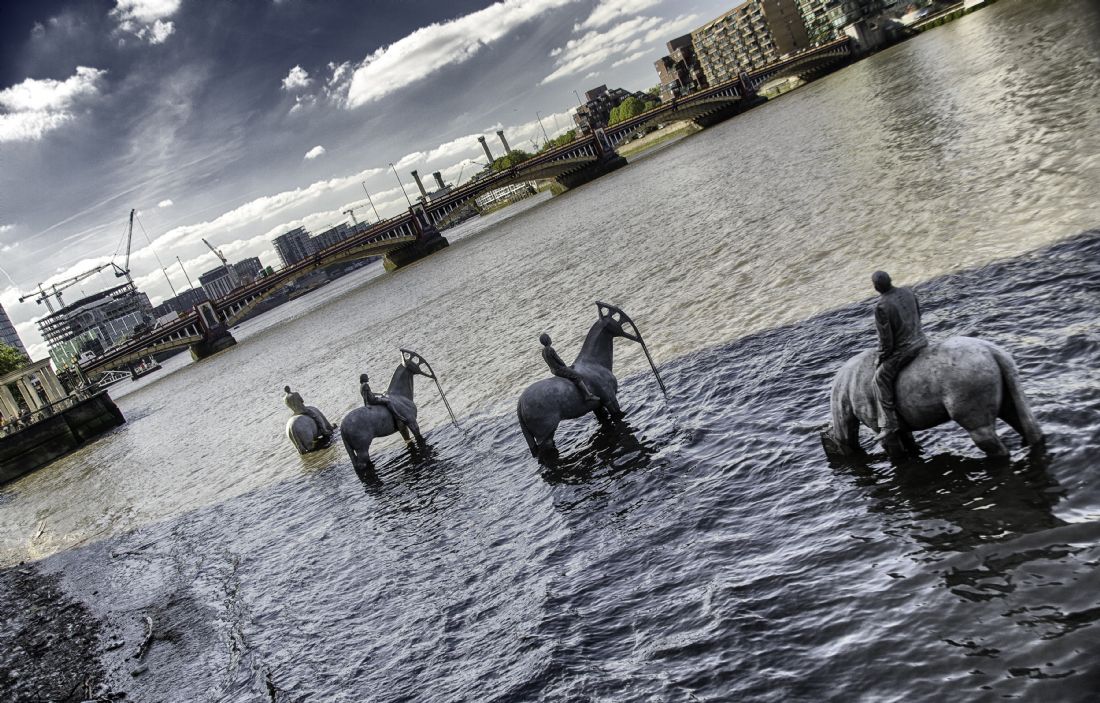River Thames installation, 2015 at Vauxhall by Jason deCaires Taylor. Note the four horsemen lead you to the US embassy, then under construction. Battersea Power Station and Vauxhall Bridge are also in evidence
