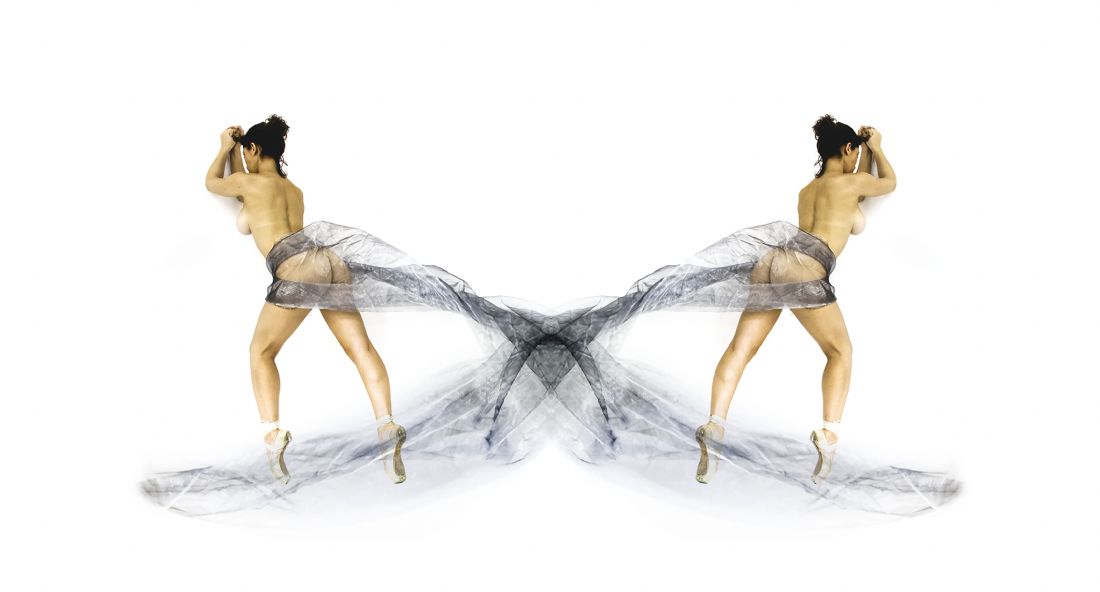 Composite of my work. Ballerina commissioned by me to execute a pose wearing a silver veil that I could reflect to create a bow between two ballerinas.