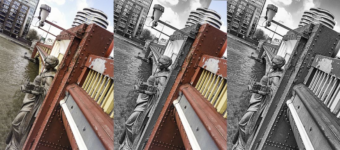 Did you know there is a miniature St Paul's cathedral upstream on the River Thames from the actual St Paul's cathedral It's part of Pomeroy's superb bronze allegorical statue 'Architecture' situated on the architecture of Vauxhall Bridge. I risked my camera to get this shot, digitally edited into a triptych as part of my HAH* project (*half and half).