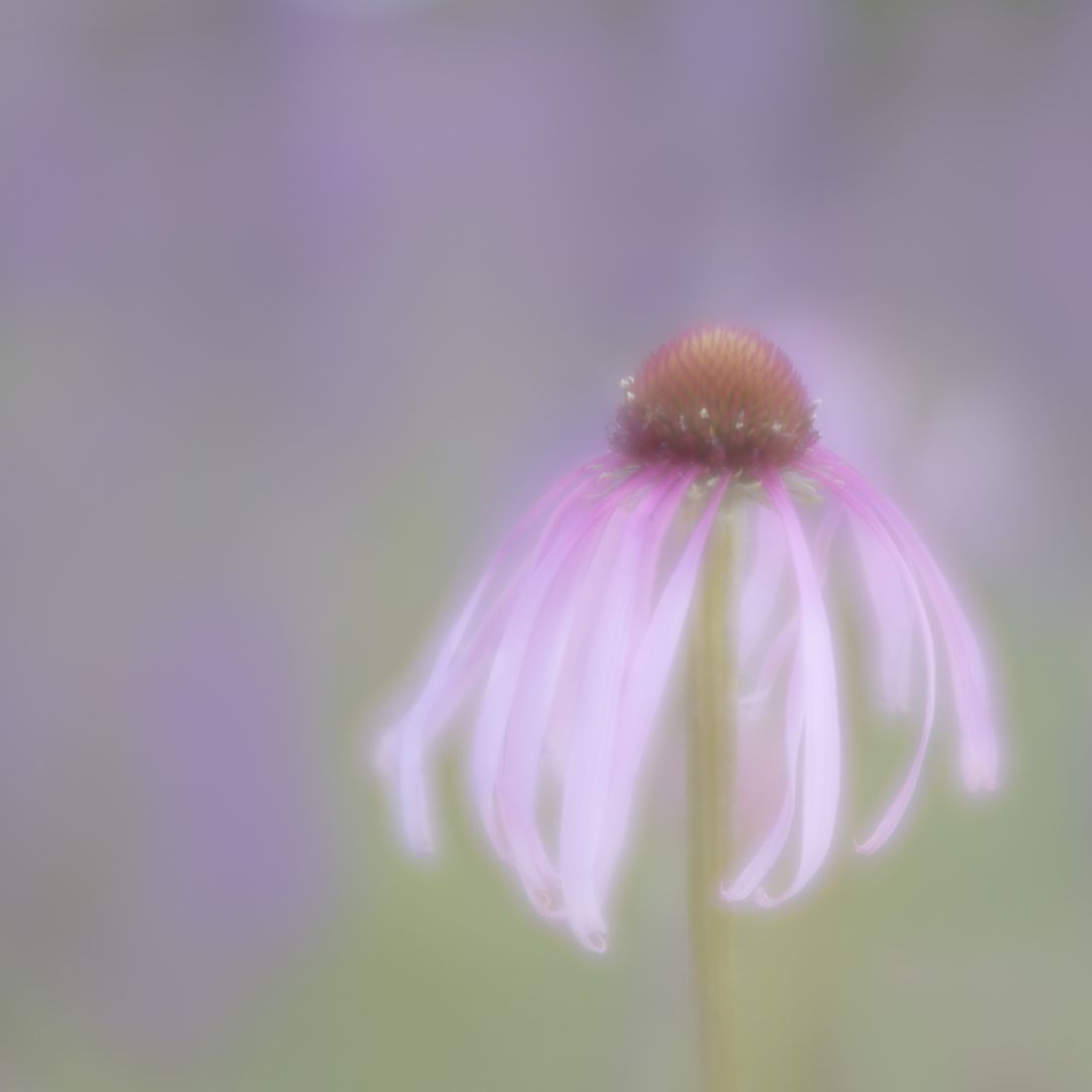 A delicate echinaca flower with pink petals and a conical center stands out against a soft, pastel background. The gentle focus accentuates the ethereal quality of the scene.